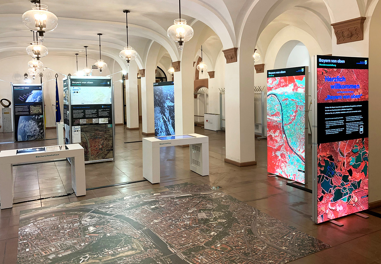 Anlässlich des fünfjährigen Bestehens des Bayerischen Landesluftbildzentrums stellte die Wanderausstellung dessen Angebote einem breiten Publikum vor. Die multimedial gestaltete und leicht verständlich aufbereitete Ausstellung vermittelt einen spannenden Einblick in die Geschichte und Technik der Luftbildfotografie. Auf 14 Ausstellungstafeln wurde den Besucherinnen und Besuchern gezeigt, wie Luftbilder gemacht werden, wie sie aufbereitet werden und wo sie eingesetzt werden.
